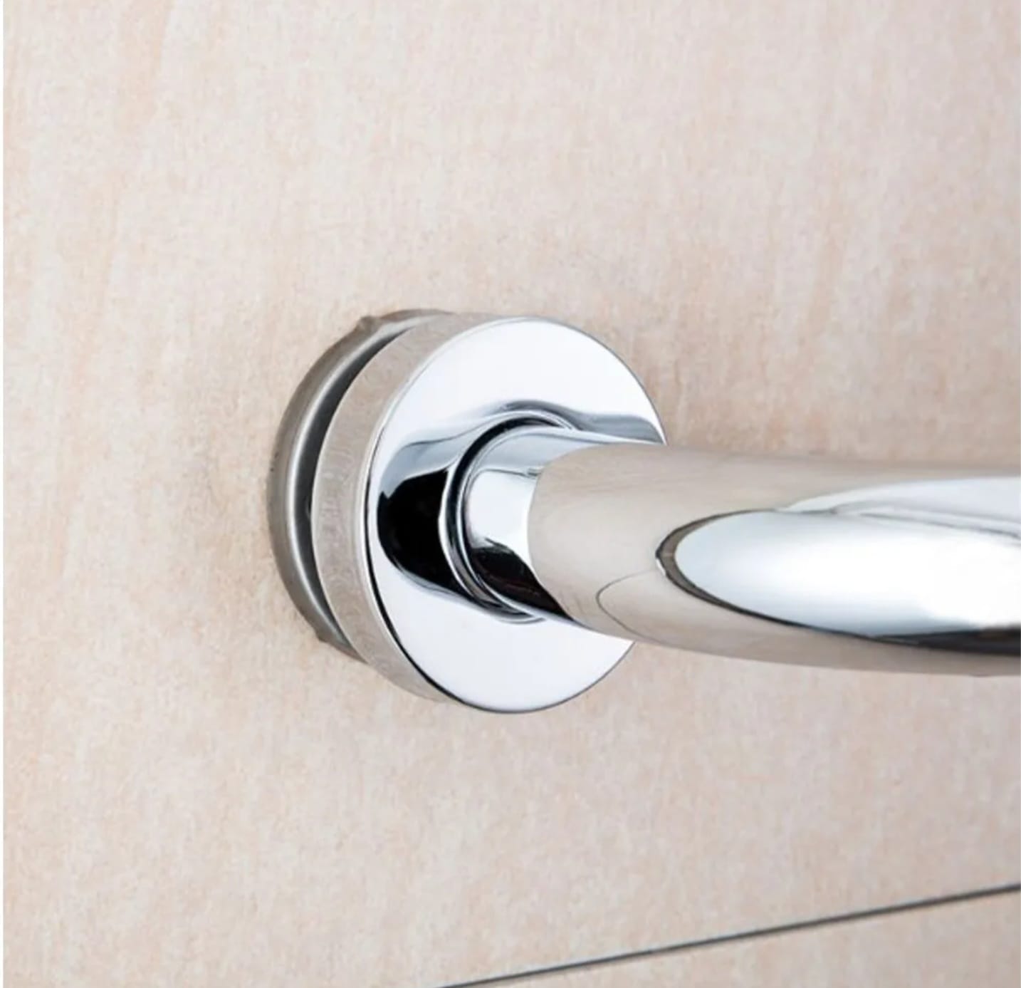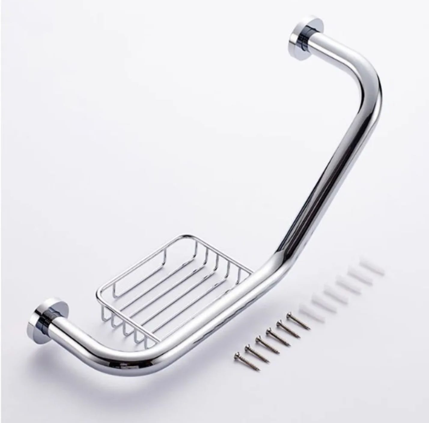 Agarradera de seguridad con jabonera movible (mano derecha o mano izquierda) incluida. Caño 100% acero inoxidable de 22 mm de espesor con dos rosetas cubriendo los tornillos.