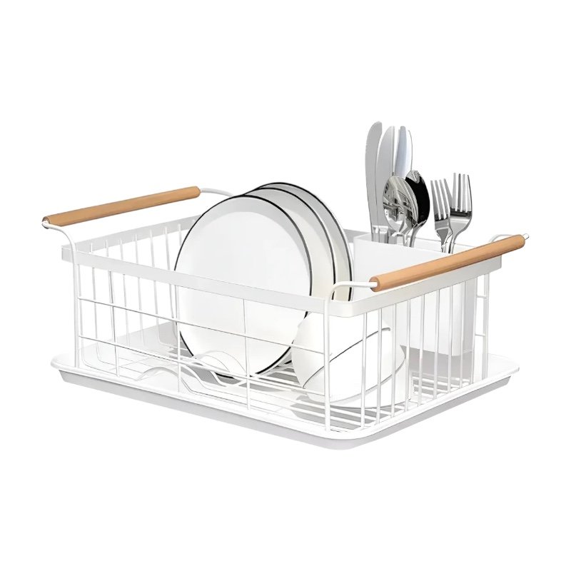 Este escurreplatos de acero pintado y madera combina funcionalidad y estilo. Su diseño en color blanco lo hace ideal para cualquier cocina moderna. Tiene capacidad para 9 platos y cuenta con una bandeja y un cubiertero de PVC, lo que facilita el drenaje del agua y la organización de los cubiertos.
