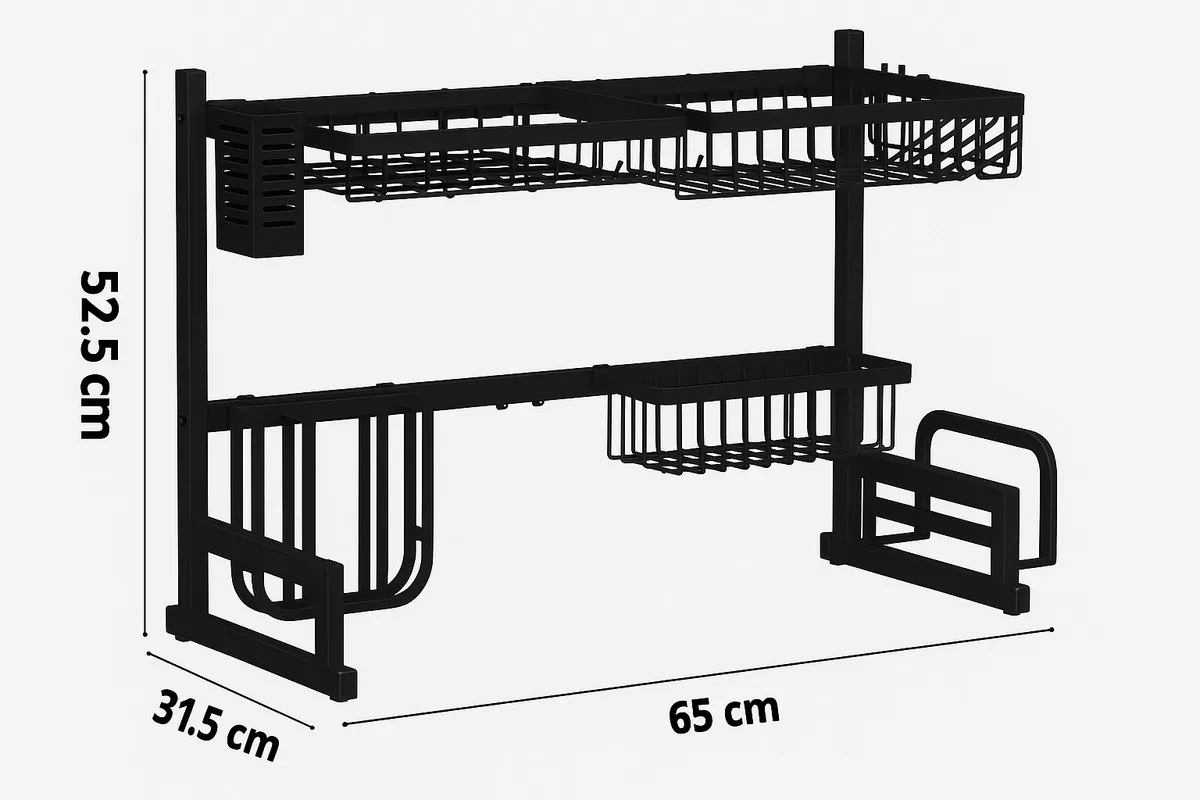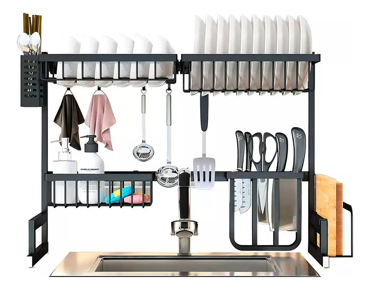 El paquete incluye: 1 escurridor para platos, 1 estante para frutas y verduras, 1 estante para platos, 1 cesta rectangular, 1 cubiertero doble, 1 soporte para cuchillos, 1 estante para tabla de cortar, 5 ganchos para utensilios, 4 sopapas, 1 llave allen, 1 instrucciones de instalación.