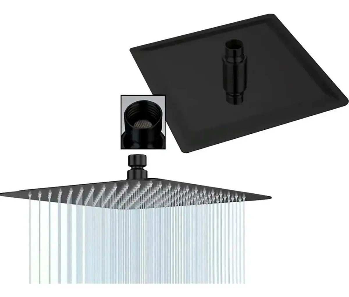 FLOR DE DUCHA Esta ducha de lluvia Cuadrada de acero inoxidable de 8 pulgadas presenta un acabado Negro Mate elegante y está diseñada para instalación en el techo en baños. Hecha de acero inoxidable 304 duradero, asegura un flujo de agua a alta presión (0,6-0,8MPA) mientras ofrece una funcionalidad ecológica de ahorro de agua.