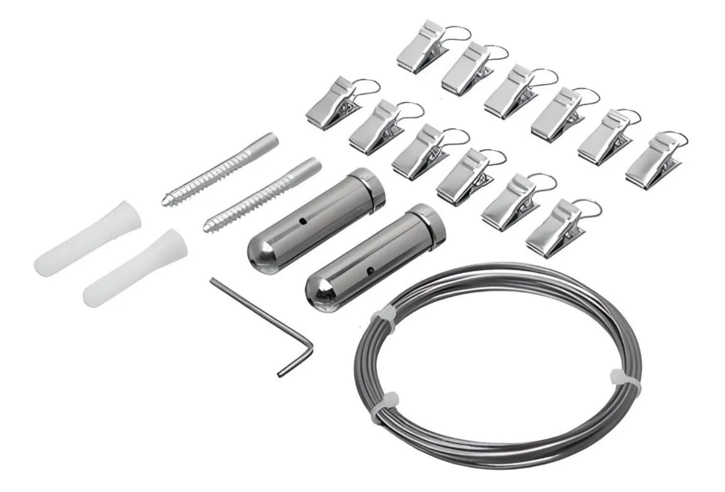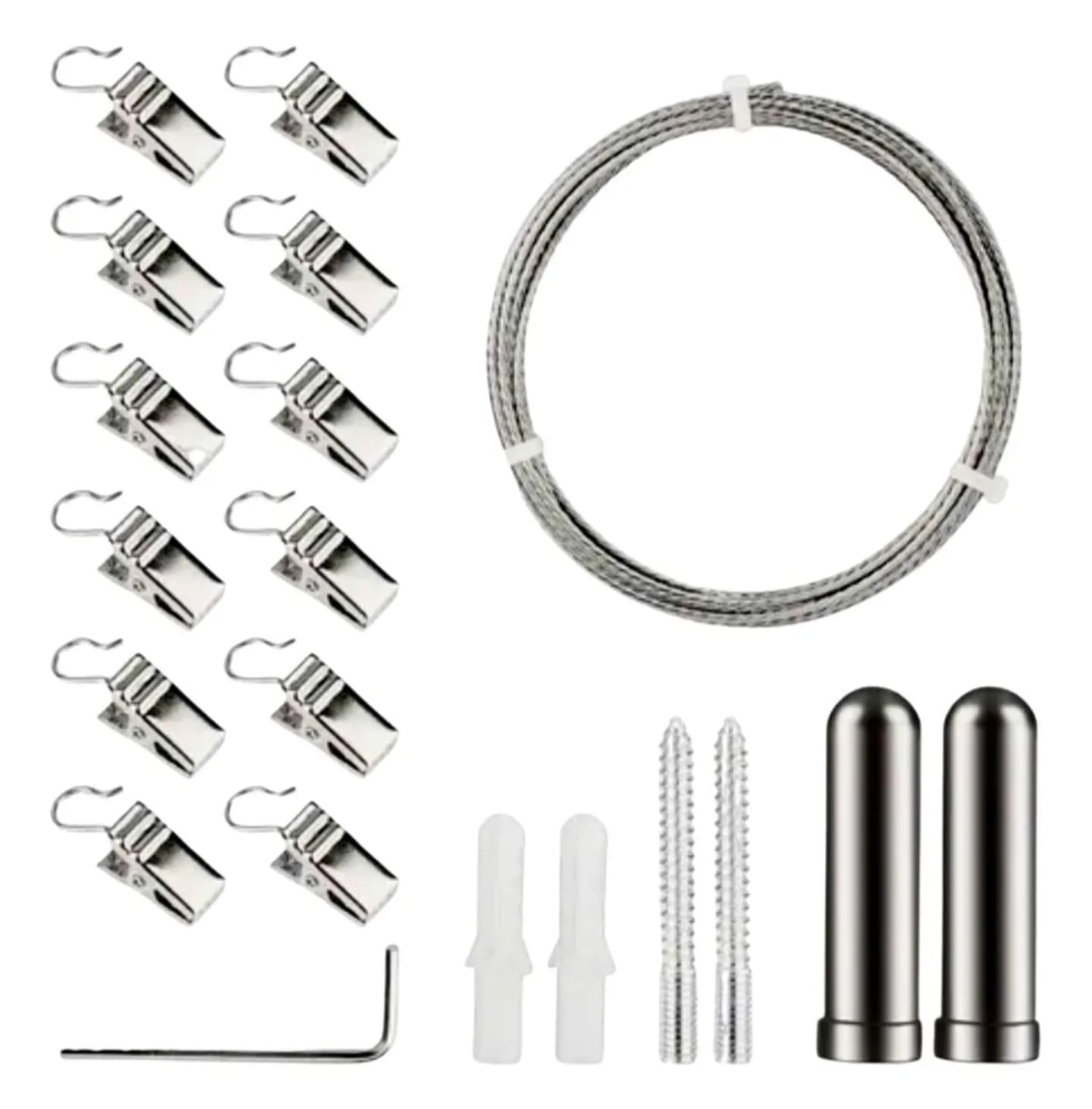 - Soportes metálicos ajustables: Permiten un tensado perfecto del cable, asegurando que tu cortina permanezca en su lugar.