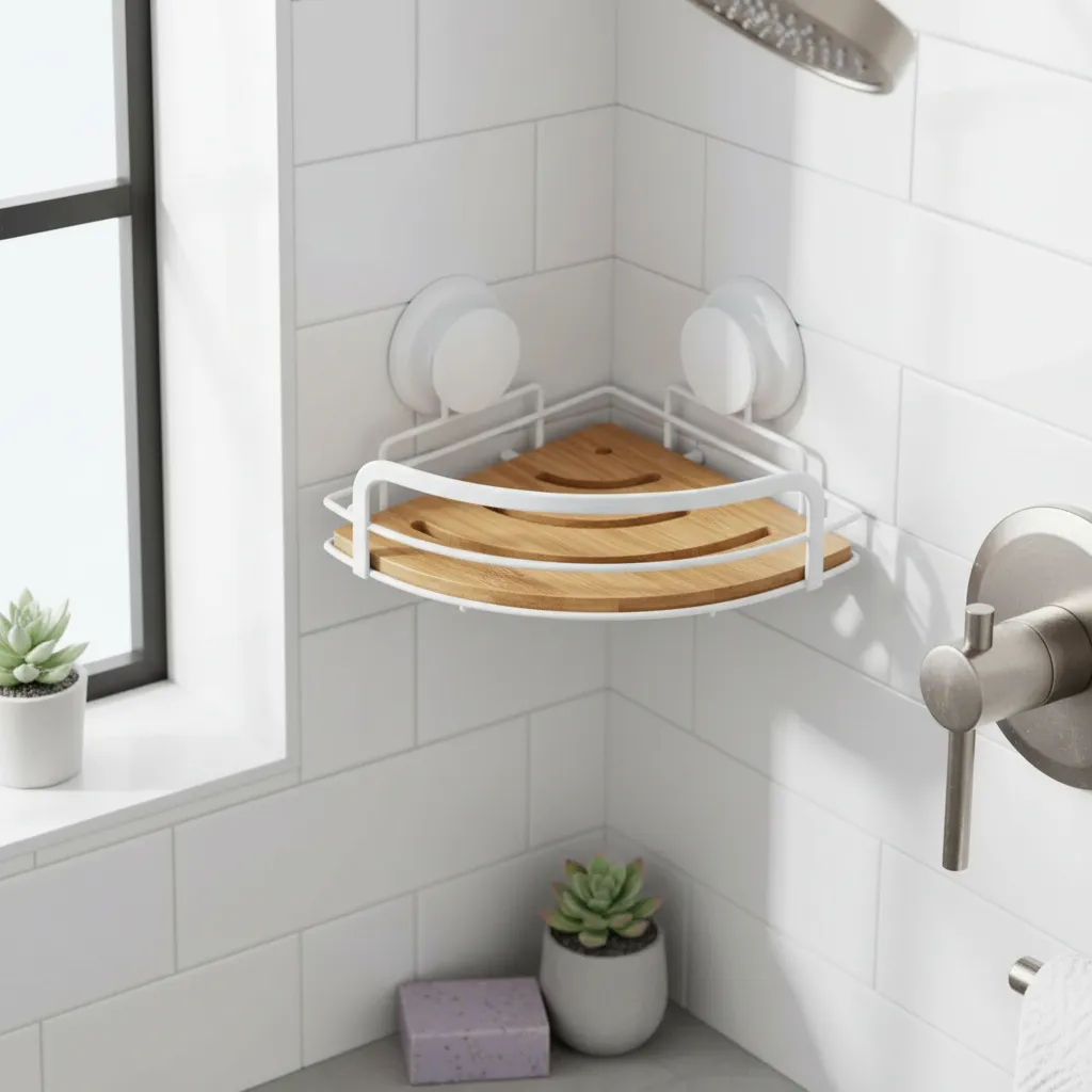 Estante de madera con ventosas resistente al agua gracias a una laca que evita su deterioro y corrosión. Fácil de armar e instalar