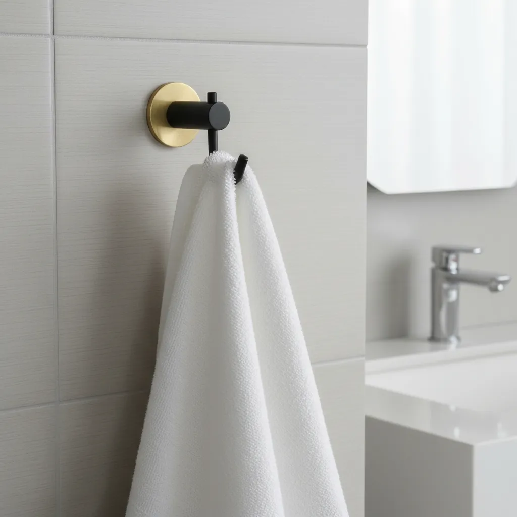 Percha de amurar. Material Bronce pintado en negro mate. Roseta pulida mate con laca.