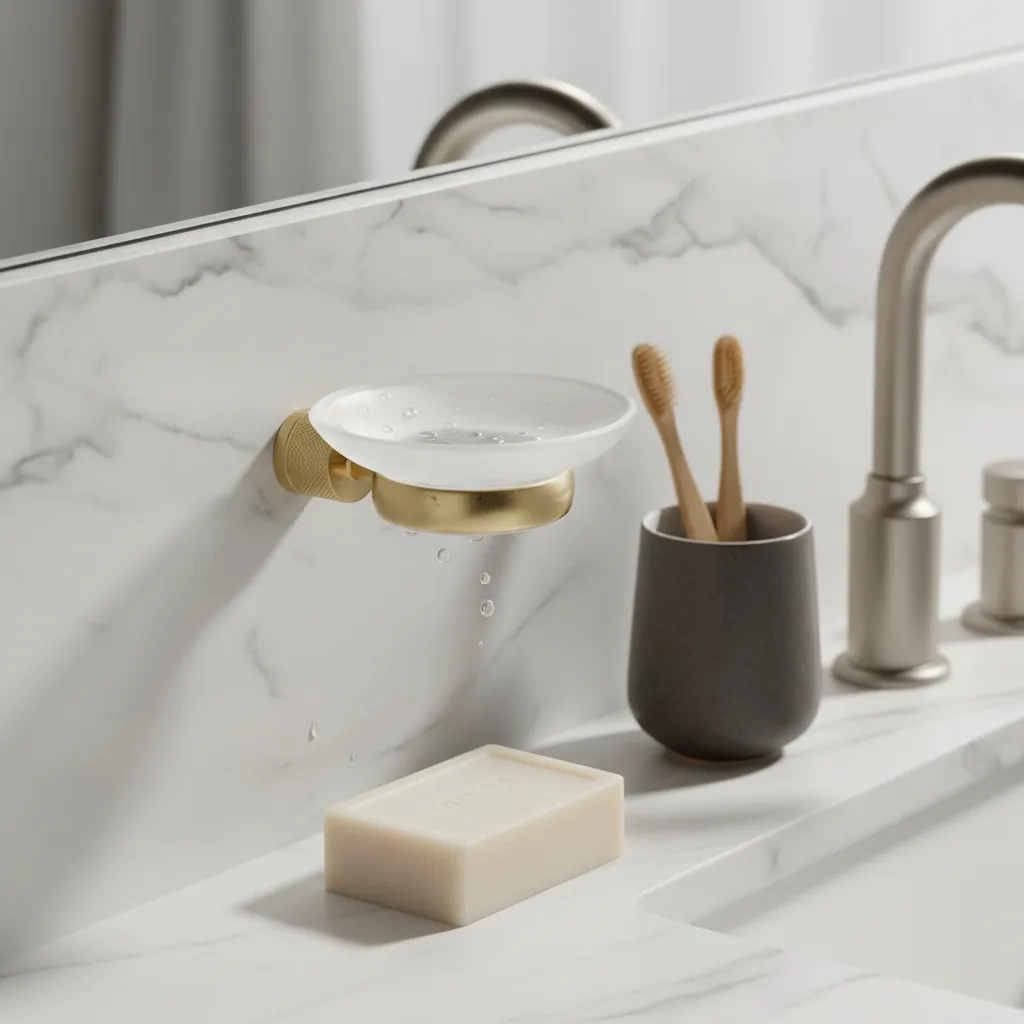 ESTÉTICA INDUSTRIAL Y CALIDAD DE ALTA GAMA. Renovamos tu baño con la jabonera de pared de la Línea Fabric de Peirano, una pieza que combina la delicadeza del vidrio esmerilado con un exclusivo soporte metálico en acabado Gold (Dorado Mate). Su presencia minimalista y el detalle de textura moleteada en su soporte aportan un toque de distinción único, ideal para ambientes que buscan un equilibrio entre modernidad y elegancia clásica.