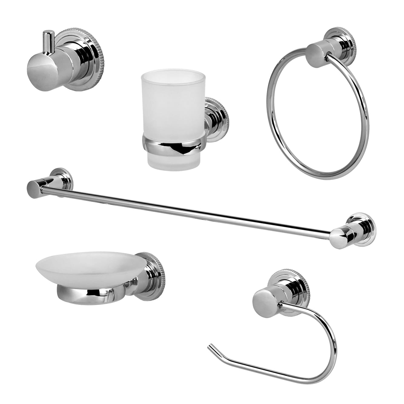 Incluye: Un portavaso, Un toallero barral de 60 cm, Un portarollo, Un porta jabonera, una percha y un toallero Aro