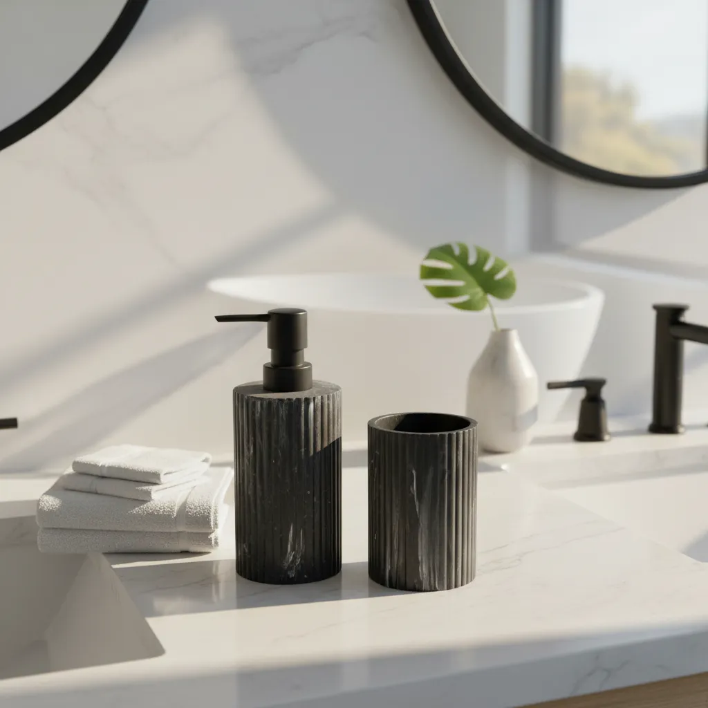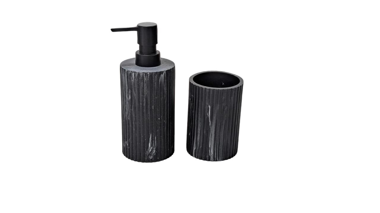 ESTÉTICA VANGUARDISTA Y ELEGANCIA DIARIA. Elevá la presencia de tu vanitory con este set exclusivo de 2 piezas confeccionado en Resina de alta densidad. Su acabado en color Negro Mate Marmolado presenta vetas suaves y una textura acanalada que aporta un estilo moderno, sofisticado y sumamente táctil a tu cuarto de baño.