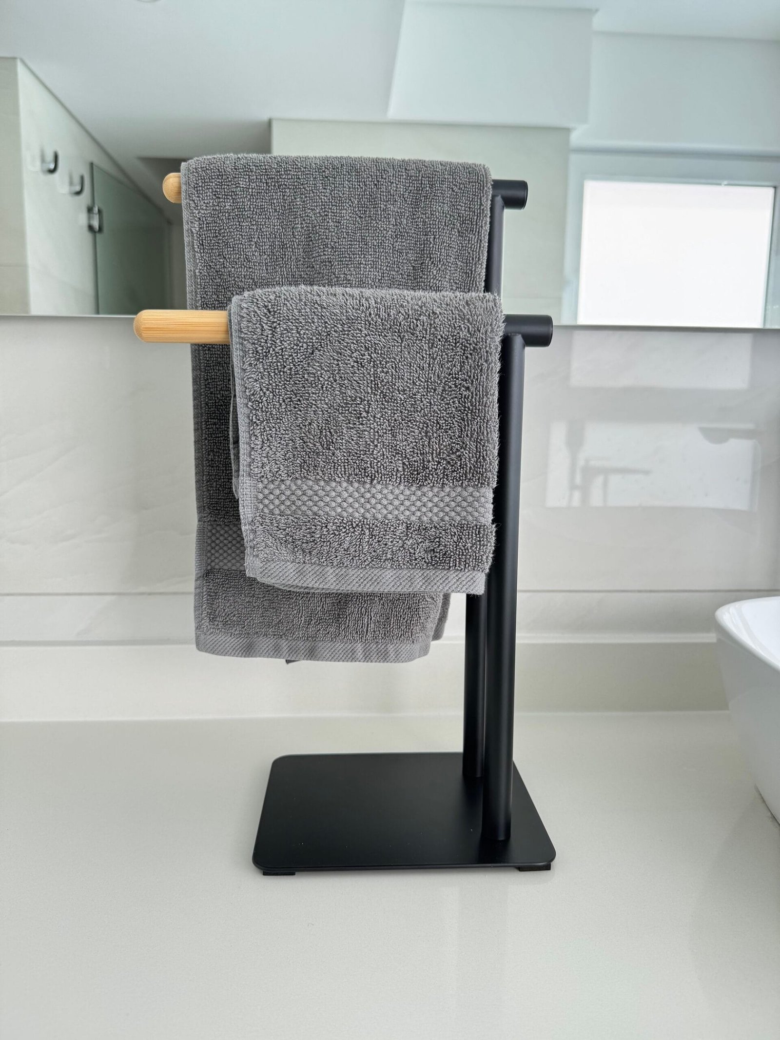 Diseño funcional: Cuenta con una estructura robusta y elegante, con un soporte de barra que permite colgar las toallas de forma cómoda y ordenada.
