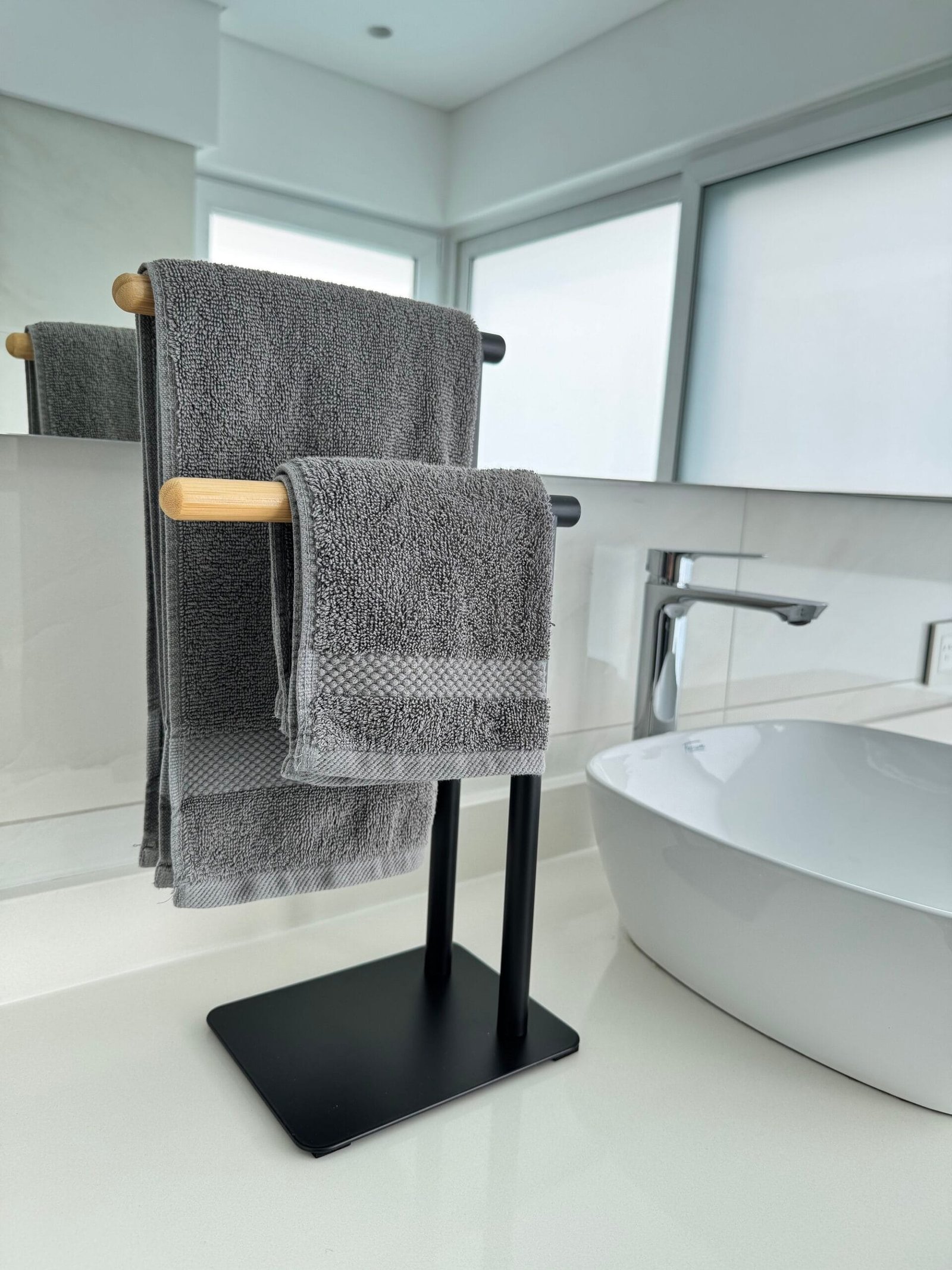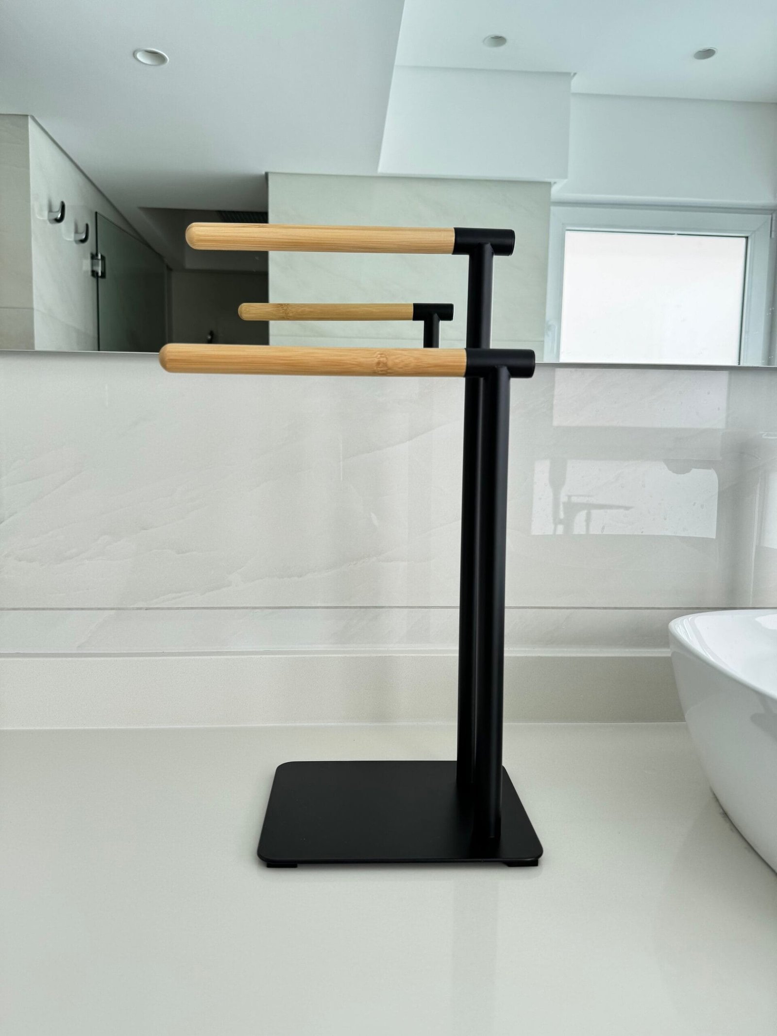 Toallero de Pie Doble Altura Negro Mate y Bambu